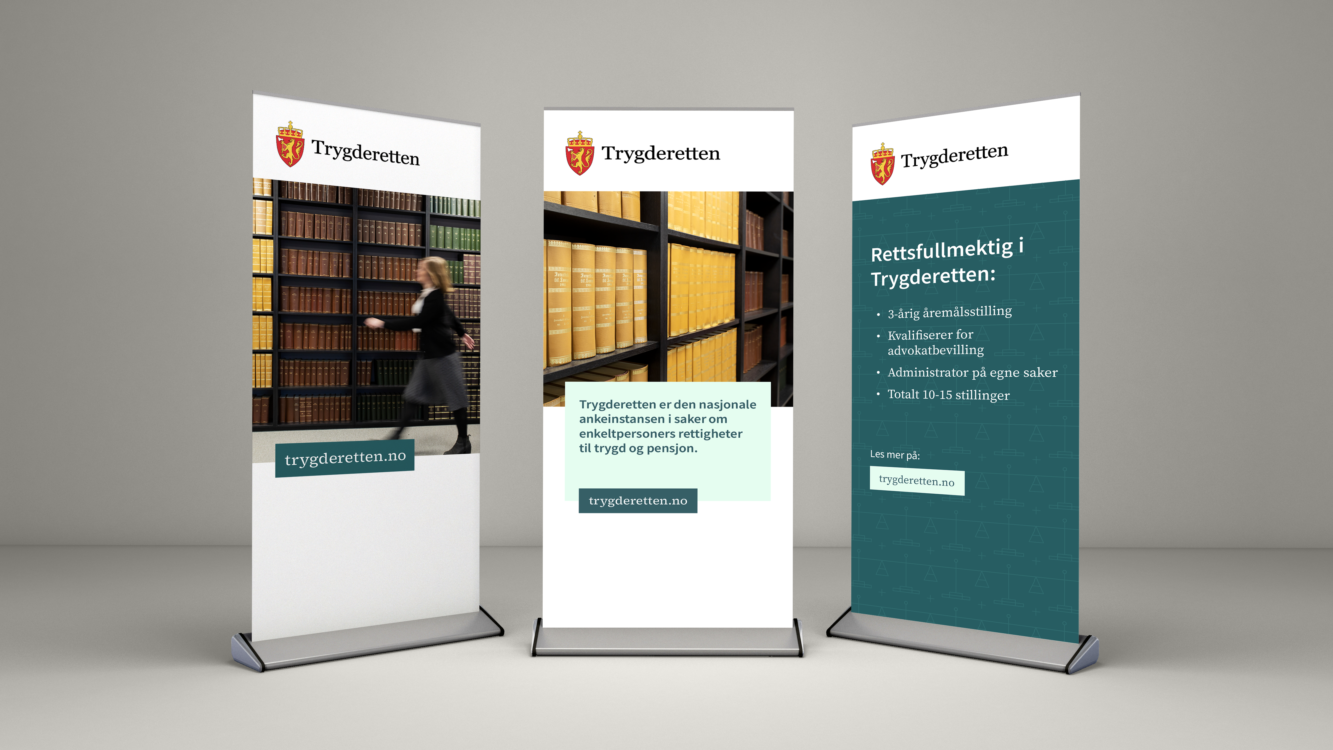Det er laget tre ulike rollup-maler for Trygderetten. Én med kun bilde og url, én med bilde og noen linjer om Trygderetten, og en til stillingsutlysning. Disse malene er laget i InDesign, og kan endres der til å passe andre budskap.
